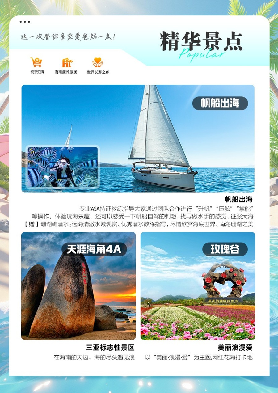 分界洲岛5A、南山5A、天涯海角5A、玫瑰谷、帆船出海、凤凰九里书屋、神州半岛灯塔、石梅湾最美公路、天涯小镇(马岭)